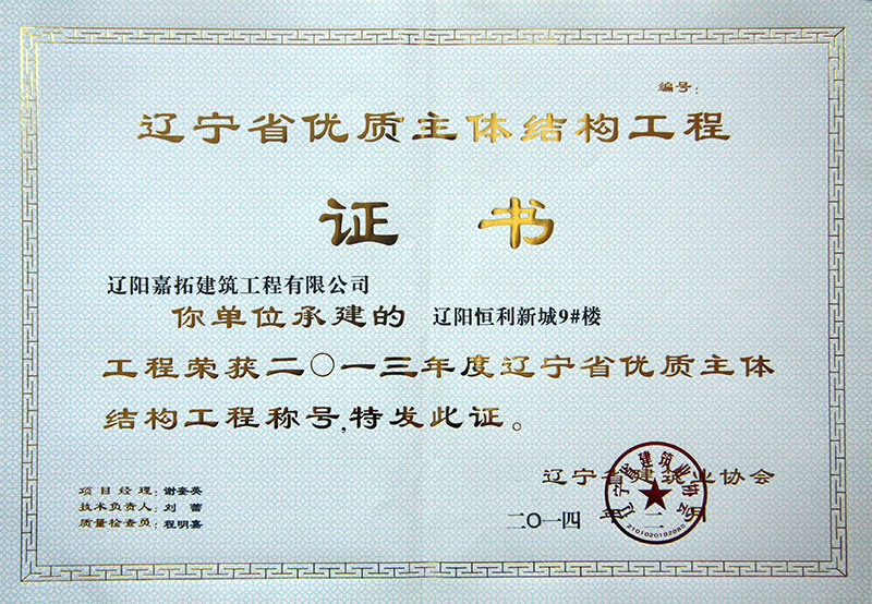 2014年度遼寧省優(yōu)質(zhì)主體結(jié)構(gòu)工程